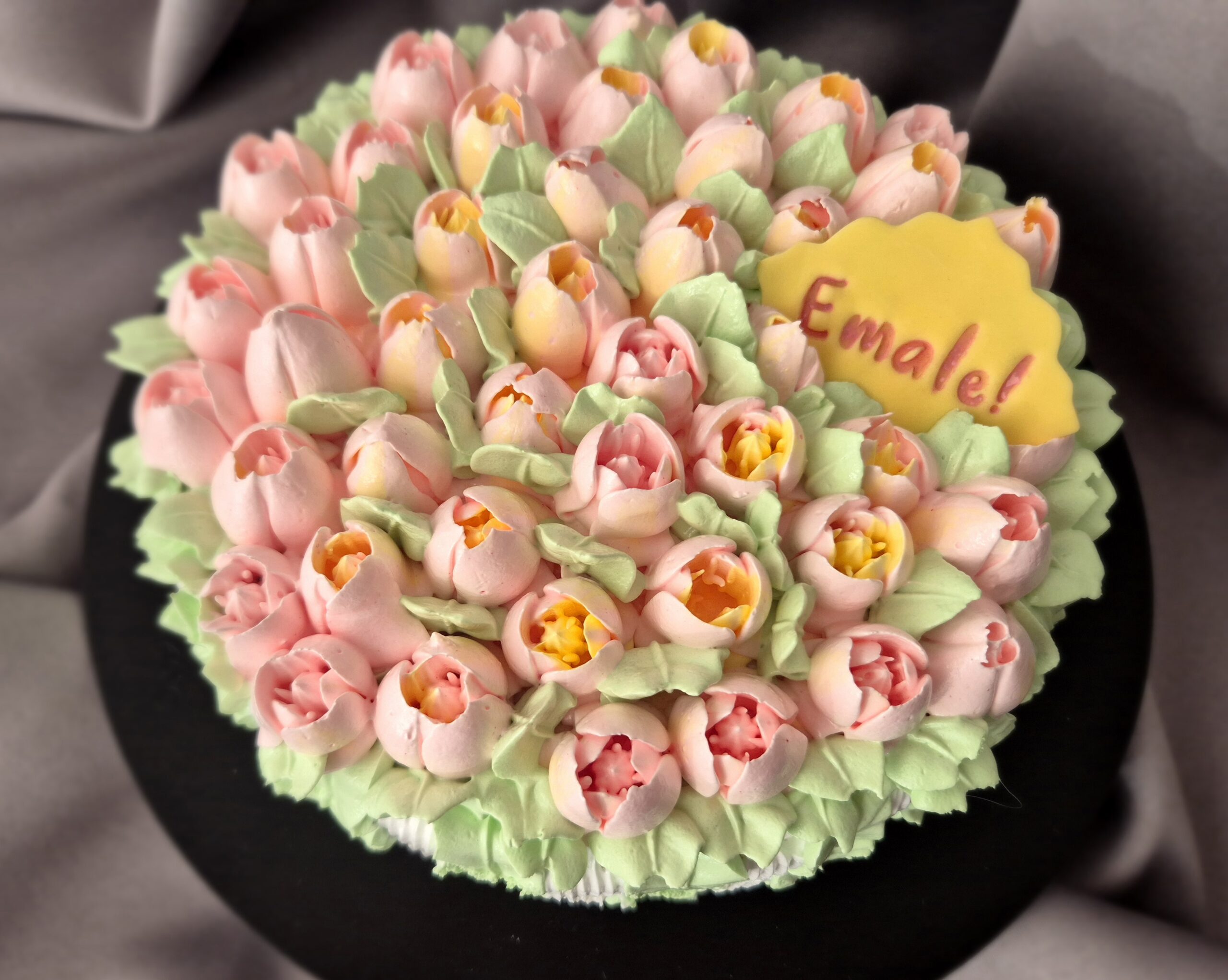 Kahe heleda biskviitpõhja vahele mahub mõnus kogus täidiskreemi, milles hapukaid maitseid annavad naturaalne passionipüree ja vaarikas. Tort on kaetud sefiirist tulpidega ja suhkrumassist tahvlil kiri Emale!